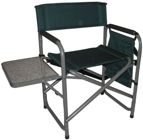 - Chair includes padded armrests, side table, organizer pocket and carrying strap