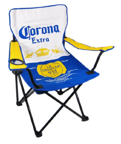 This super cool blue, yellow and white Corona Extra beer folding camp chair has a heavy duty steel frame and a heavy 600 denier nylon seat to give you years of use. It features the Corona Extra label design. The chair holds up to 275 pounds easily, and has hard plastic feet to keep you sturdy. The chair measures 34 inches tall, 34 inches wide, 20 inches deep with a seat height of 18 inches. It's great for use at home, at the beach, for tailgating, or other outdoor occasions. It comes with a carry bag that also has the Corona logo.
