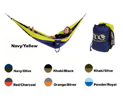 Sure to appeal to technical backpackers and recreational users alike, the SingleNest hammock by Eagles Nest Outfitters (ENO) is lightweight, functional and easy to use. The SingleNest packs into its own integrated stuff sack, reducing to the size of a large grapefruit! The full dimensions of the SingleNest hammock are 4'7" x 9' 10" and the total weight is a mere 18 oz. The combination of breathable woven nylon, nautical grade hanging line and triple-interlocking nylon stitching ensures the quality construction of each SingleNest. NOTE: The SingleNest includes integrated carabiners to aid in set up, but rope (not included) or an ENO SlapStrap suspension system (sold separately) or another method of suspension is required to use the hammock. WARNING: As accidents can happen, do not exceed the maximum weight of 400 lbs. and do not hang your SingleNest hammock more than 18 inches above the ground. Always make certain that the surface beneath your SingleNest is free of rocks or sharp objects. The ENO SingleNest is available in your choice of color options.